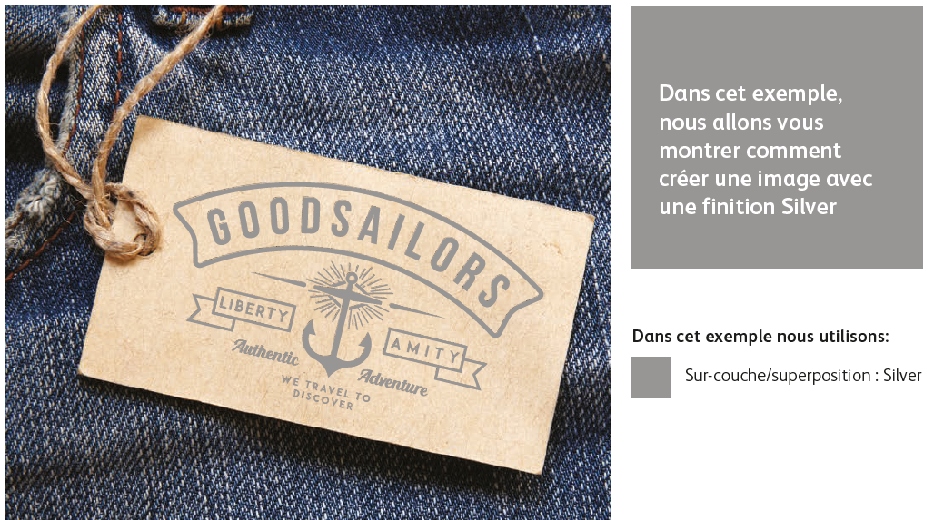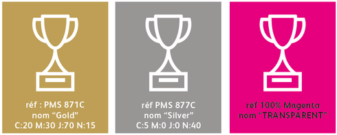 Cette sublimation peut être réalisée en Underlay (en dessous du CMJN, sous couche) pour l'OR et l'ARGENT ou en Overlay (au-dessus du CMJN, surcouche) pour l'OR, l'ARGENT et le TRANSPARENT