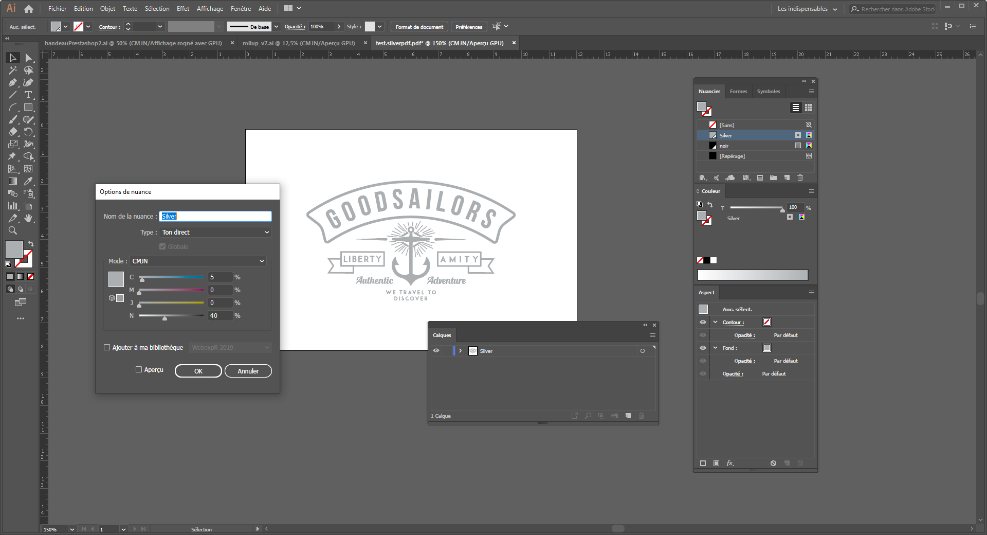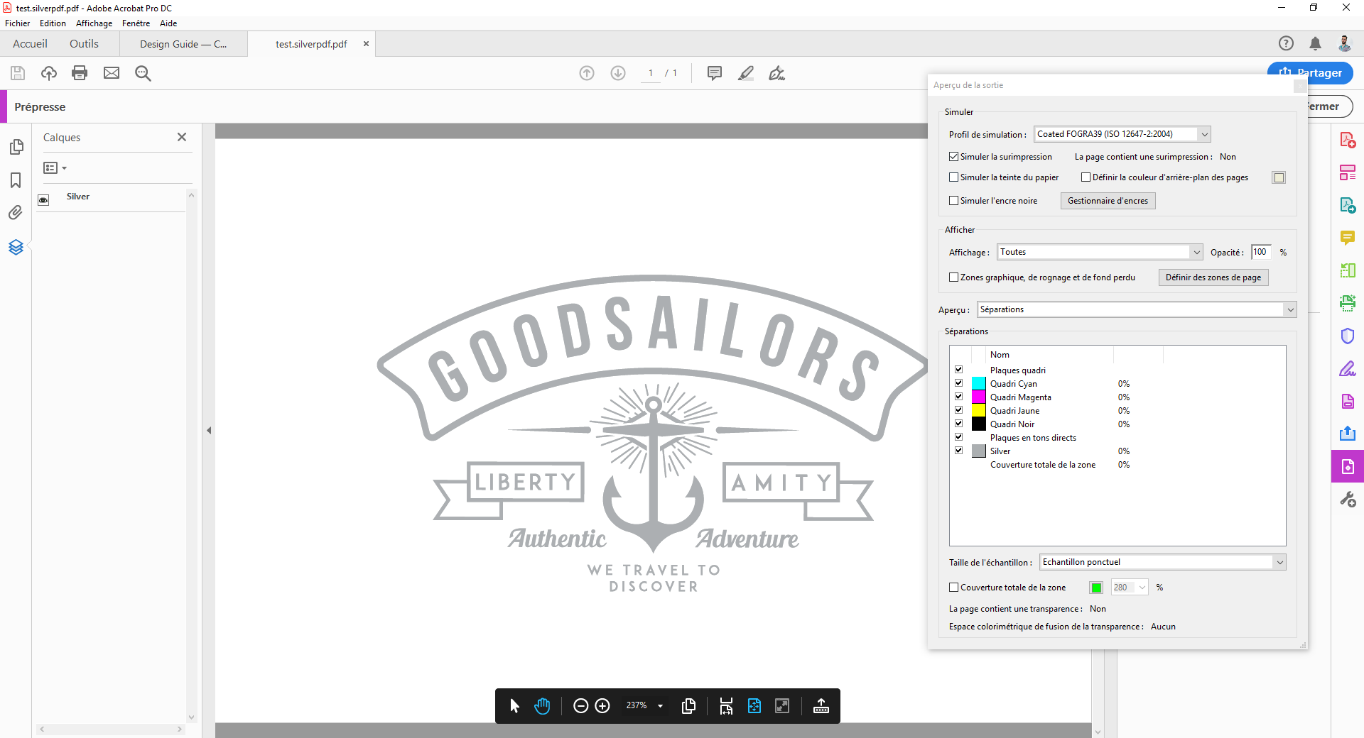 Une fois le pdf généré on peut voir que le calque Silver (ARGENT) apparait bien ainsi que la couleur Silver (ARGENT) en Ton Direct