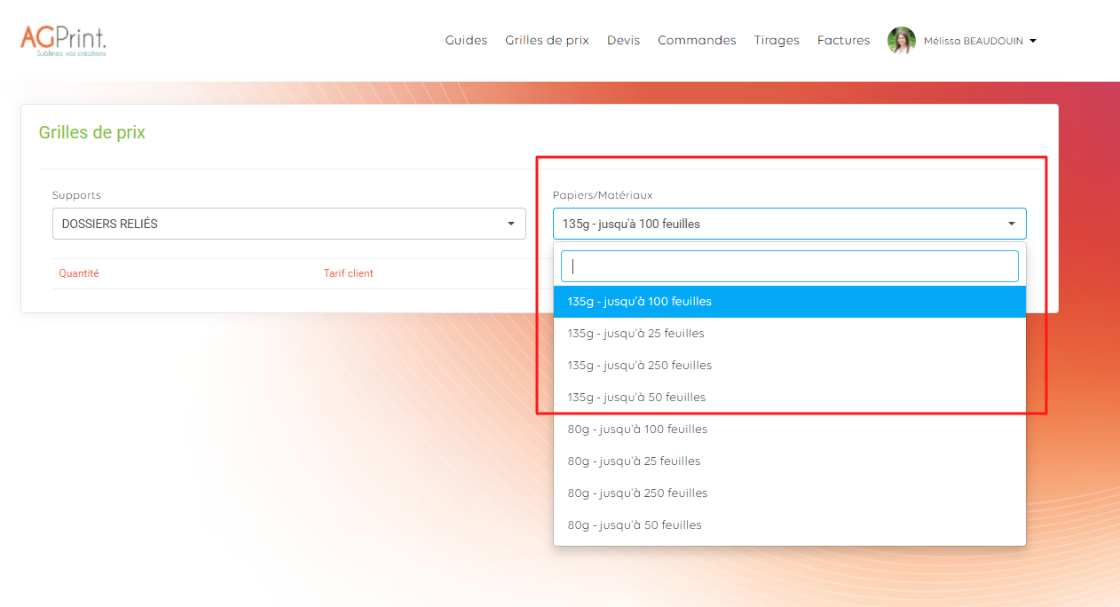 Sélectionnez le type de papier et finition souhaité dans la deuxième liste déroulante