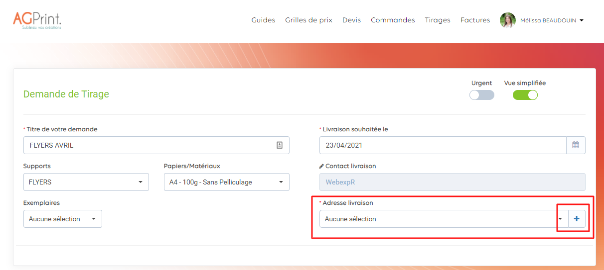 Sélectionnez une adresse de livraison parmi la liste déroulante ou ajoutez-en une avec le “+”